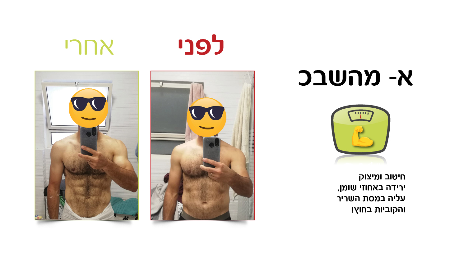 2 שקילות בחודש! ודיווח אישי – נשקלים בבית, מצלמים ושולחים לי.